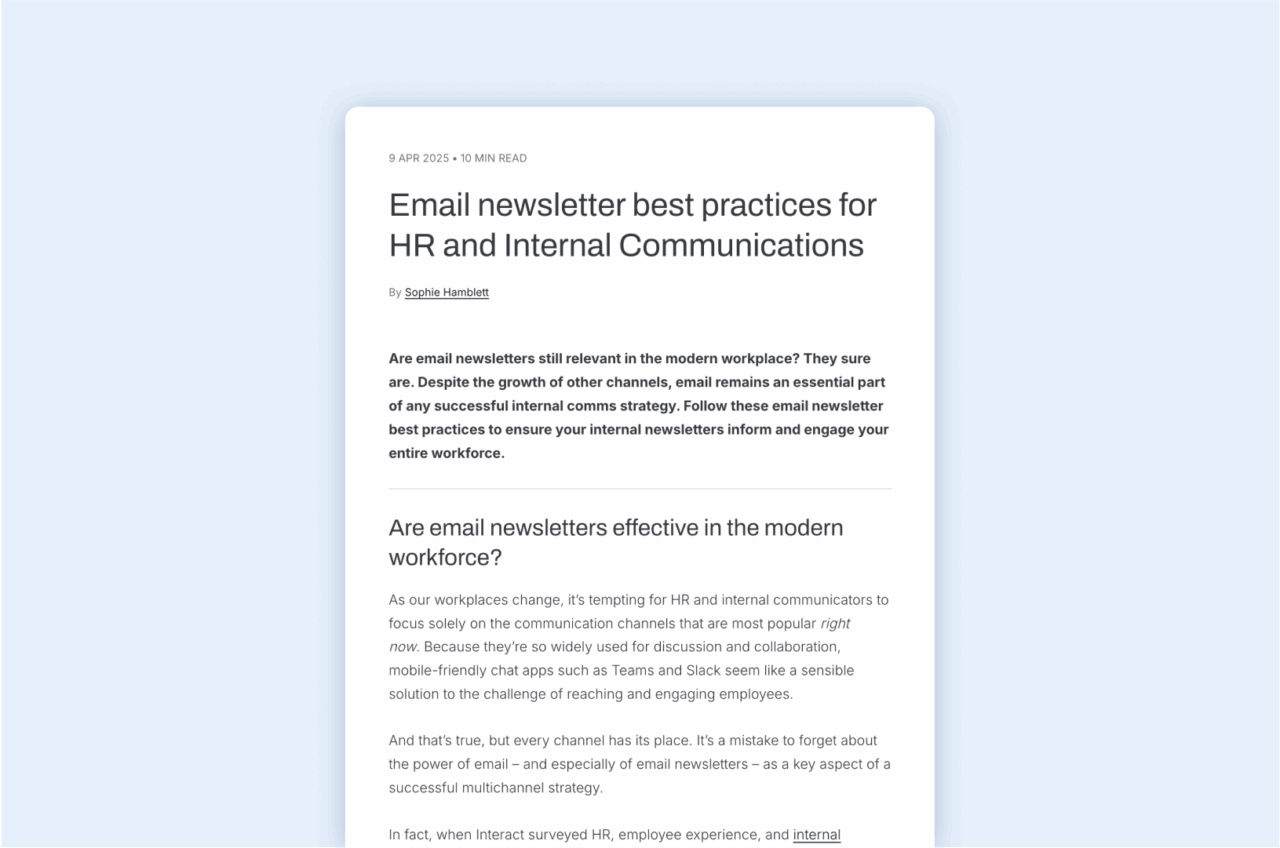 While it may seem like this creates another channel to manage, the good news is the content you’ve already created on your intranet can easily be repurposed using Interact’s Email Newsletter add-on.